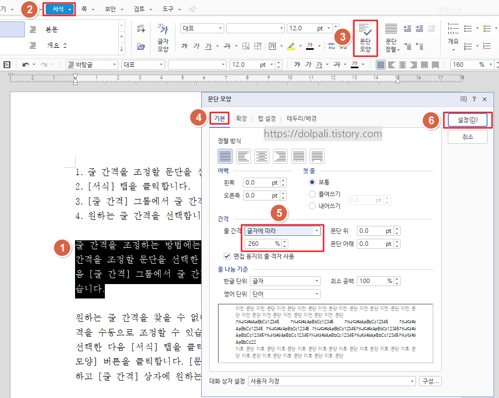 5. 줄 간격에서 [글자에 따라], 260%을 입력합니다.