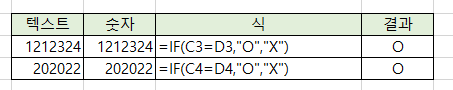 현재 예시로 든 엑셀의 수식은 "텍스트" 열과 "숫자" 열을 비교하여 결과 열에 같으면 "O" 다르면 "X"를 표시하도록 되어있습니다.