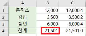 돈까스 12,000원, 김밥 3,500원, 쫄면 6,000원을 전부 더하면 21,500이 되어야 하지만 어째서 인지 합계를 21,501원이 되어 있습니다. 합계에 있는 수식은 =SUM(B1:B3)으로 되어 있으니 수식 자체가 잘못된 것은 아닐 것입니다. 1의 비밀은 C열에서 보면 소수점이 0.4+0.2+0.4가 있어 1이 된 것을 확인할 수 있습니다. 소수점이 있는 경우 의도한 것이 아니라면 소수점까지 표시하도록 하면 혼선을 막을 수 있습니다.