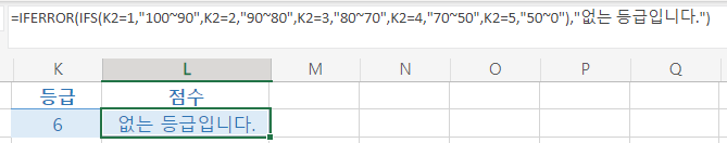 =IFERROR(IFS(K2=1,"100~90",K2=2,"90~80",K2=3,"80~70",K2=4,"70~50",K2=5,"50~0"),"없는 등급입니다.")