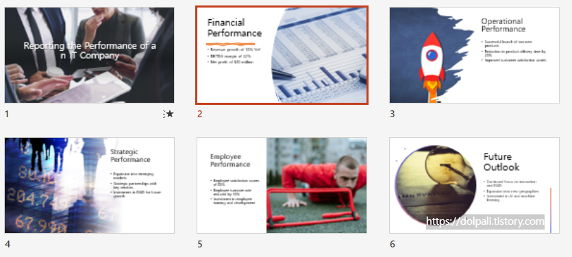 위 사진은 IT기업의 실적 보고를 위한 PPT 디자인을 요청하고 코파일럿(Copilot)에서 만들어준 디자인입니다. 개인적으로는 IT기업의 느낌이 잘 살지 못하고 전체적으로 통일성이 없어보입니다. 너무 사진이나 이미지 보다는 깔끔한 템플릿 위주로 만들어 줬으면 어땠을까 하는 생각이 들었습니다.