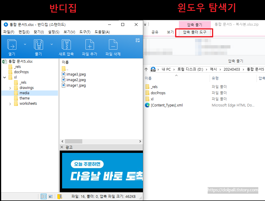 다만 엑셀, 워드, 파워포인트(ppt)라고 할지라도 xlsx, docx, pptx 등과 같은 확장자에서만 사용이 가능한 방법입니다. 확장자를 변경하는 방법과 압축프로그램을 사용하는 방법 두 가지를 공유해 보도록 하겠습니다. 압축프로그램이 없다면 반디집을 추천드립니다.
