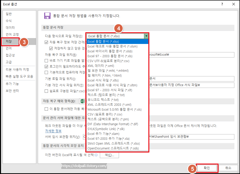 4. [다음 형식으로 파일 저장]에서 기본으로 저장하고 싶은 파일 형식을 선택합니다.