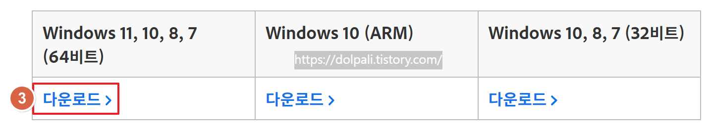 3. 자신의 OS에 맞는 프로그램을 다운로드합니다. 몇 비트인지 모르신다면 아래 링크를 접속하여 사용 중인 PC의 정보를 확인해 보시기 바랍니다.