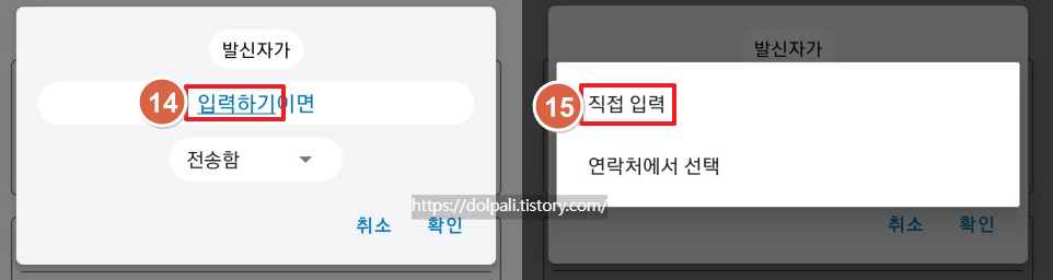 18. 문자를 전달하고 싶은 발신자의 전화번호를 입력하고 [확인]을 클릭합니다.