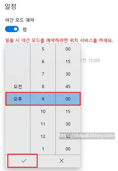 야간모드는 그 이름대로 주간보다는 야간에 주로 사용합니다. 매번 야간모드를 켜고 끄기가 번거로우므로 시간을 설정해 놓을 수 있는데 위치 설정까지 하면 해당 지역의 일몰 시간에 맞춰 야간모드가 동작합니다. 하지만 여기서는 시간 예약까지만 해보겠습니다.