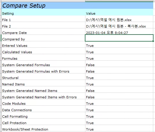비교가 끝난 결과를 보면 변경된 셀이 녹색으로 표시된 것을 볼 수 있습니다.
