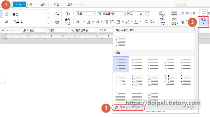 2. 한글 글 번호(개요) 자동 입력