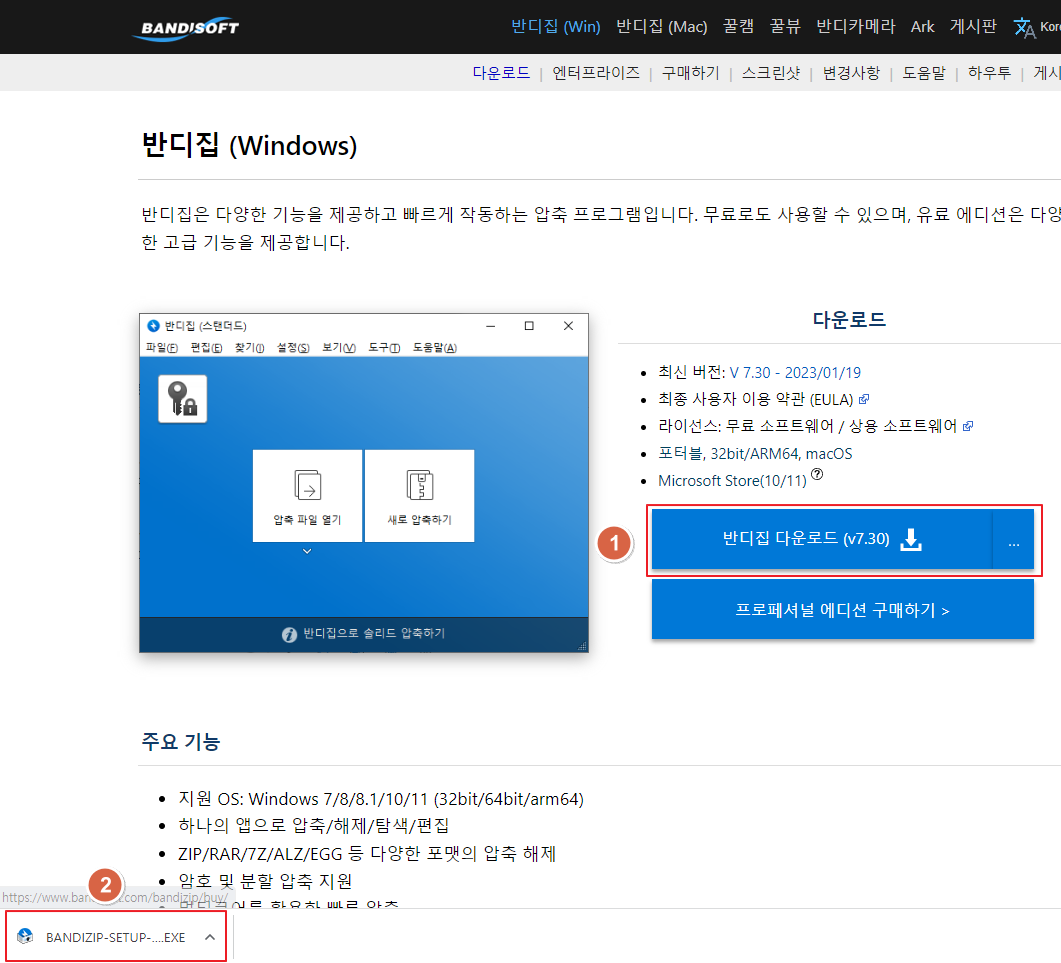 위 배너를 클릭하여 반디집 공식 홈페이지의 다운로드 페이지로 이동합니다.