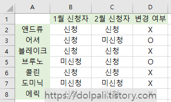위 수식은 앤드류의 1월 신청 여부와 2월 신청 여부를 비교하여(IF(B2=C2,) 값이 일치하면 "X"를 일치하지 않으면 "O"을 표시하라는 뜻입니다.