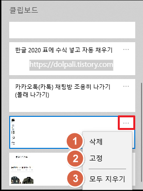각 클립보드 항목에 있는 메뉴 버튼을 클릭하면 세가지 각 항목을 관리할 수 있습니다.